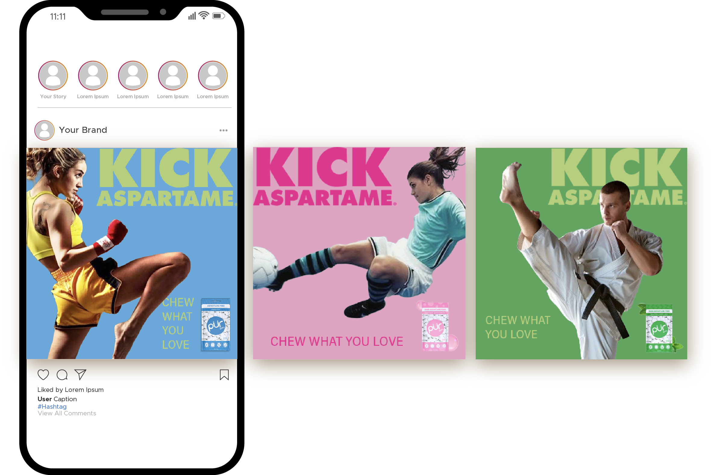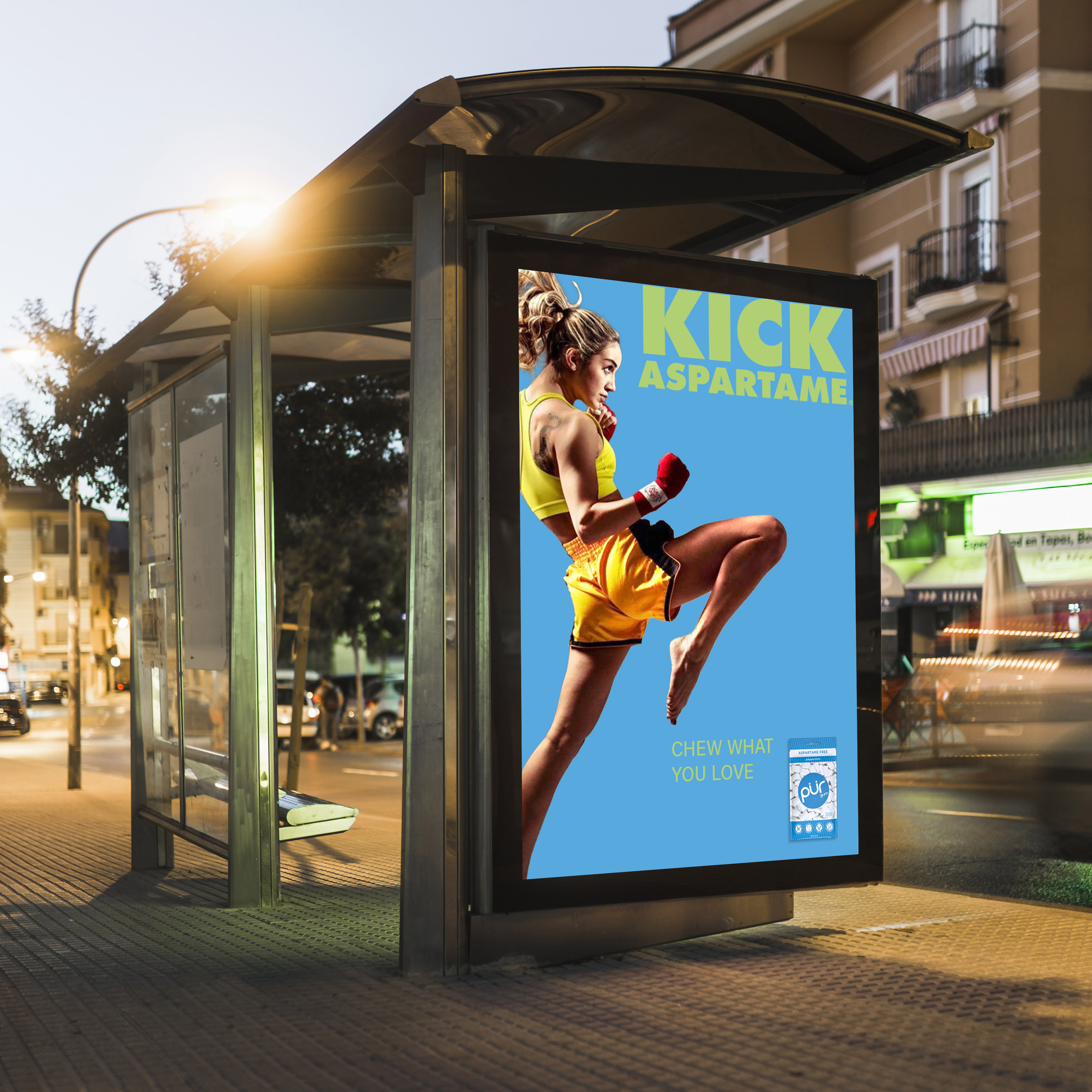 After establishing Kick Aspartame as the bold, disruptive headline, I wanted a supporting line that softened the message and spoke to everyday choice. Chew What You Love was developed to reframe the idea of “giving something up” into a positive, empowering decision.
